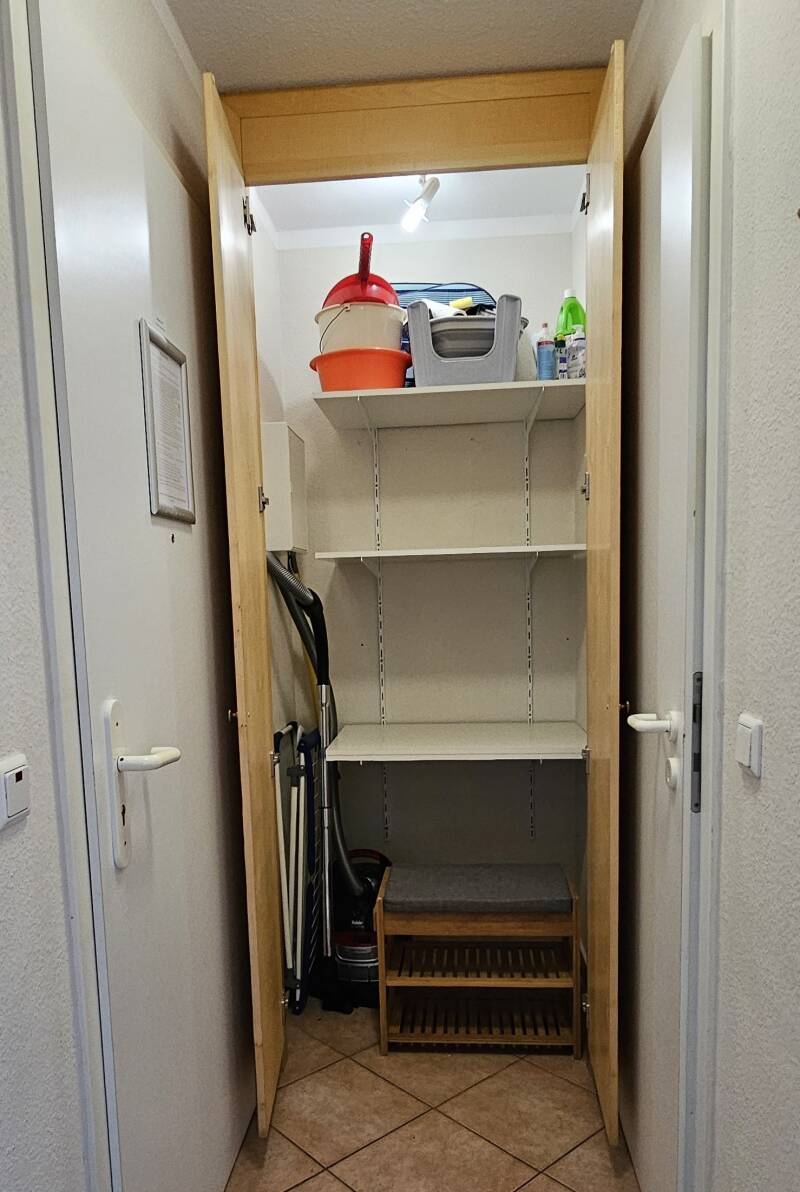 In the hallway there is a further cupboard with two large compartments for storing suitcases and bags as well as a shoe rack with seat cushion.