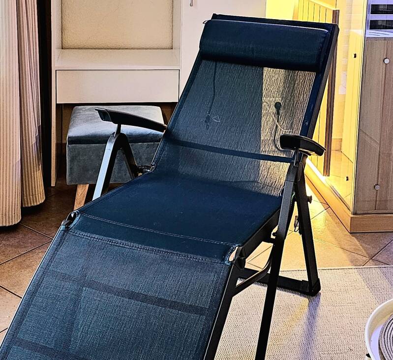 ... free use of the infrared sauna is a welcome wellness experience that helps to improve your general well-being. Naturally, this is not a reclining sauna, but a sitting sauna, so that the infrared rays reach the entire body (feet, calves, knees, pelvis, back, both sides of the body) evenly.