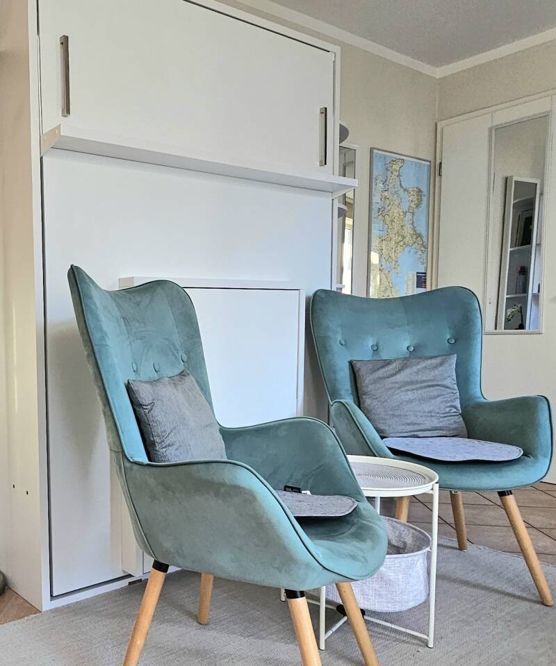 To improve the sense of space and living atmosphere, a small side table and two comfortable wing chairs with the wall bed behind them form the centrepiece of the room instead of a free-standing bed or sofa.
